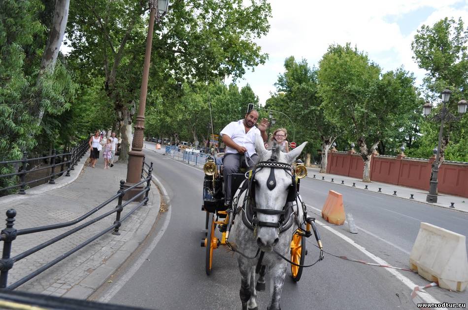 Вышли на площадь, понимаем что времени не так много, а хочется побольше посмотреть. Увидели повозки, на которых катают по городу, мальчик нам рассказал и показал на карте как они возят и мы с радостью согласились на 45 минутную поездку вдоль набережной реки Гвадалквивир к площади Испании. Там наш рулевой нас любезно сфотографировал, по пути еще посмотрели массу интересного.