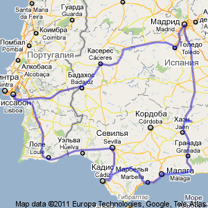 Мадрид (3 ночи) – Толедо (1 ночь) – Касерес (1 ночь)- Лиссабон (2 ночи) – Фаро (1 ночь) - El Puerto de Santa Maria (1 ночь) – Торремолинос (2 ночи) – Нерха (2 ночи) – деревня Рус (1 ночь) – Мадрид (1 ночь). Всего 15 ночей.